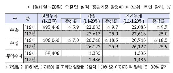 관세청은 이달 1~20일의 수출입 실적이 수출 276억 달러, 수입 261억달러, 무역수지 15억달러 흑자를 기록했다고 21일 밝혔다. 이는 전년 대비 수출 25.0%, 수입 25.8% 증가한 규모이다.