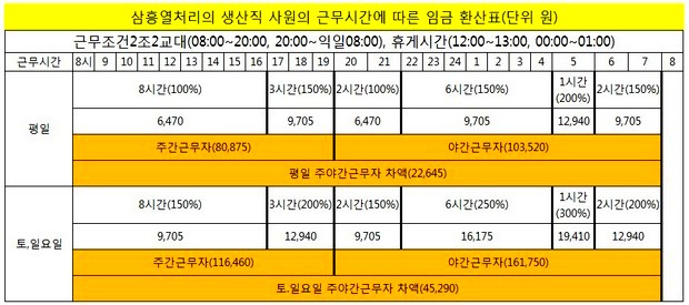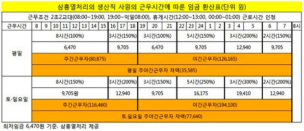 삼흥열처리에서 주야간 2교대로 일할 경우 일할 경우 평일 주간근무자는 8만875원의 일당을 받는다. 야간 근무자는 12만6,165원을 받는다. 이들 시간 근무자는 토·일요일에는 일당을 각각 11만6460원, 19만4100원을 수령한다.
