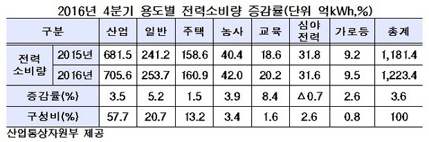 2일 산업부에 따르면 전년 동기대비 지난해 분기별 전기소비는 1.8%, 1.5%, 4.3%, 3.6% 각각 증가했다.