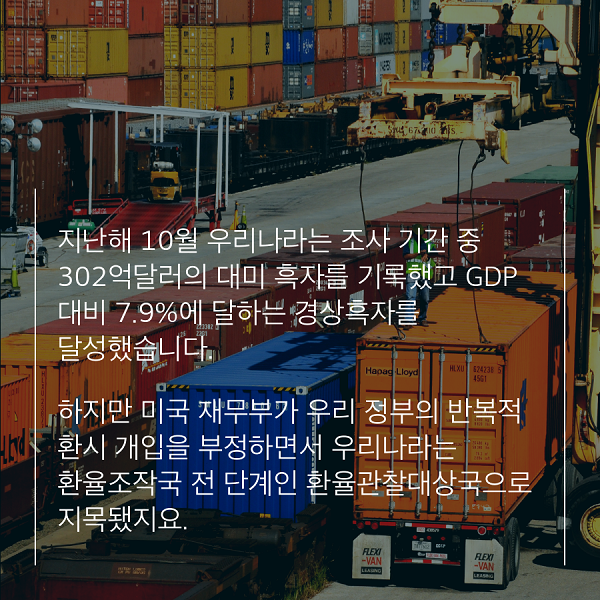 지난해 10월 우리나라는 조사 기간 중 302억달러의 대미 흑자를 기록했고 GDP 대비 7.9%에 달하는 경상흑자를 달성했습니다.