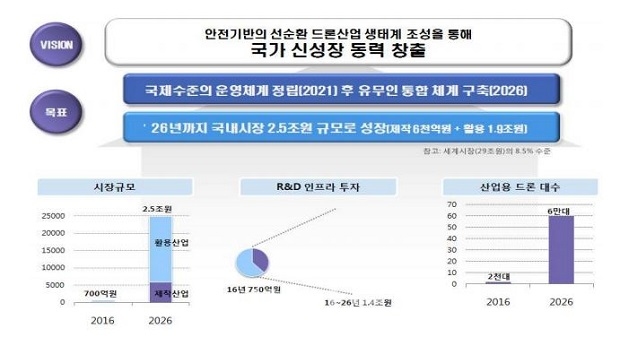 드론 로드맵은 ‘선순환 드론산업 생태계 조성을 통한 국가 新 성장 동력 창출’을 비전으로 제작시장 6천억원, 활용시장 1.9조원 규모 성장을 목표(세계 시장 8.5% 점유)로 하고 있다.