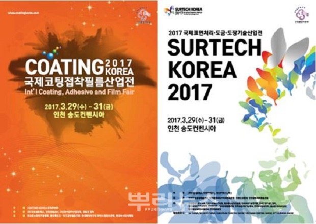 ‘2017 국제코팅접착필름산업전(COATING KOREA)’과 ‘국제표면처리·도금·도장기술산업전(SURTECH KOREA)’는 3월 29일부터 31일까지 송도컨벤시아에서 개최되며 온라인 사전등록을 통해 전시회를 무료로 관람할 수 있다.