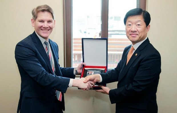 우태희 산업통상자원부 차관이 3일 서울 한 양식당에서 클레어 편리 주한 뉴질랜드 대사, 존 라일리 주한 뉴질랜드 차석 대사와 오찬을 겸한 면담을 가졌다. 이어 (위)우 차관은 존 라일리 차석 대사의 재임 기간 중 한-뉴질랜드 자유무역협정 FTA 체결과 양국 기업 간의 교류 촉진과 문화 교류에 기여한 공로로 감사패를 전달했다. 산업부 제공