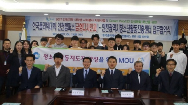 한국폴리텍대학 인천캠퍼스(학장 김소림) 금형디자인과(지도교수 정인룡)는 4월 11일 인천시청소년활동진흥센터(센터장 이근화)와 ‘2017 인천지역 대학생 사회봉사(청소년지도) 지원사업’ 협약을 체결했다.