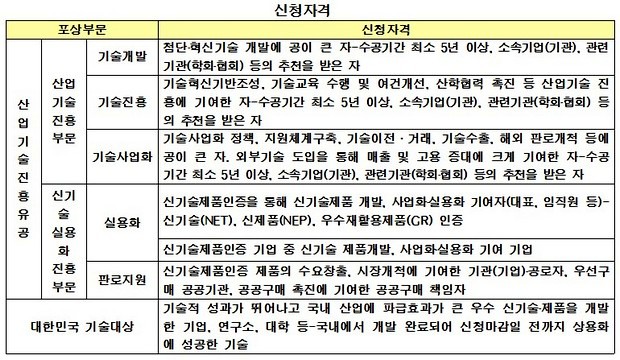 신청 대상은 자동차, 항공, 반도체, 정보기술(IT), 기계, 소재, 에너지 효율향상, 신재생 에너지 등이며, 신청 마감일 전까지 상용화에 성공한 기술이면 된다.