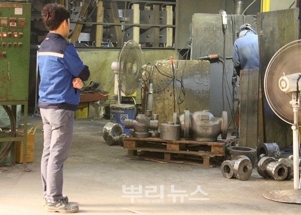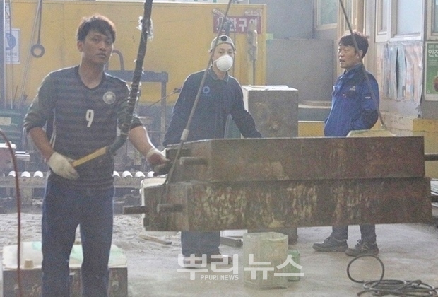 박 상무(오른쪽 첫번째))가 마스크도 없이 분진이 날리는 사형주조 공정에서 작업자들과 작업 상황에 대해 이야기를 나누고 있다. 정수남 기자