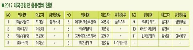 이번 '2017 태국금형전시회(InterMold Thailand 2017)'에 금형조합은 (주)금오몰드, 미주정밀, (주)삼우금형, (주)아스픽, 에이테크솔루션(주), (주)우리엠텍, (주)제이에스코리아, (주)오성테크, (주)부광테크, (주)코아씨앤티, 인곡산업(주) 등 조합원 11개사와 함께 조합원사 공동관으로 출품할 예정이다.