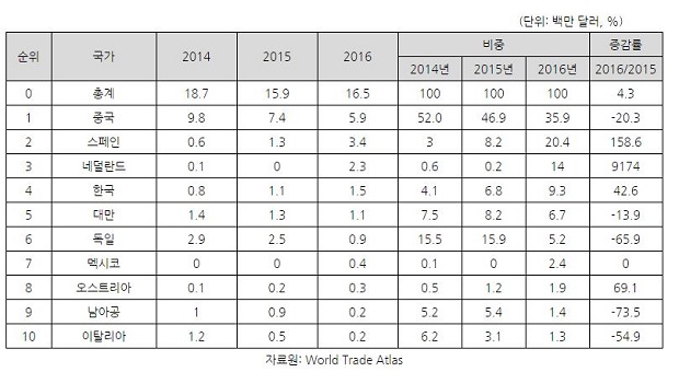 2016년 한국의 냉간압연강관 대미 수출량은 약 150만 달러로 전년 대비 42.6% 증가했으며, 이번 조사 대상국 중에서는 4번째로 많은 수출량을 기록했다.