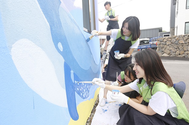 현대위아 신입사원들이 22일 제주도 서귀포시 표선면 한지동 마을에 벽화를 그리고 있다. (사진=현대위아)