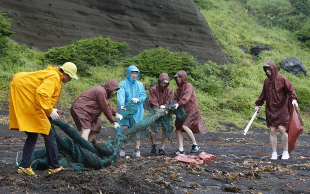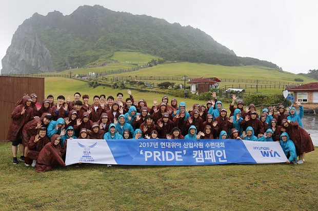 현대위아의 신입사원 65명은 20일 수련대회 시작과 동시에 제주 서귀포시 성산일출봉 앞 우뭇개 해안 청소에 나섰다. 이들은 ‘제주세계자연유산센터’와 함께 바다에서 밀려 온 쓰레기와 관광객이 버린 오물로 방치된 우뭇개 해안 일대를 청소했다. 오전 10시부터 오후 3시까지 이어진 봉사활동 덕에 성산일출봉 일대 해안은 깨끗한 모습으로 새롭게 단장했다.