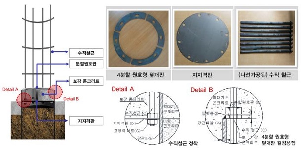 '네 개의 분할 원호판과 보강콘크리트 하부판에 수직 철근이 정착된 합성형 덮개판 공법'은 기존 덮개판 공법의 단점인 자재중량은 네 개로 분할된 원호형 덮개판을 강관에 용접결합으로 덮개판 구조 단순화 및 용접 결합방식으로 응력분산 등을 통해 구조성능을 확보할 수 있으며, 수직철근이 하부지지격판 정착으로 강관 내 토사 제거량을 최소화한다.