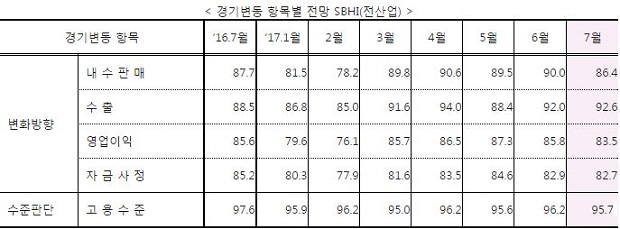 항목별로는 수출전망(92.0→92.6)에서 상승, 내수판매전망(90.0→86.4), 영업이익전망(85.8→83.5), 자금사정전망(82.9→82.7), 고용수준전망(96.2→95.7)에서 하락하였다.