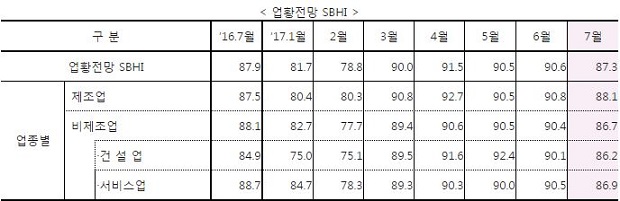 중소기업중앙회(회장 박성택)가 지난 6월 19일부터 6월 26일까지 3,150개 중소기업을 대상으로 ‘2017년 7월 중소기업경기전망조사’를 실시한 결과, 업황전망 중소기업건강도지수(SBHI)는 87.3으로 전월(90.6)대비 3.3p 하락한 것으로 조사되었다. 소비심리는 점차 개선되고 있으나 중소기업의 실적부진이 지속되고 있고, 건설업 등 일부 업종은 계절적 비수기를 맞이하여 향후 경기를 부정적으로 전망한 것으로 분석된다.