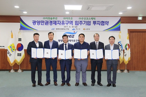 광양만권경제자유구역청(청장 권오봉)은 6월 30일 청사 2층 상황실에서 ㈜자원솔루션, ㈜아트온, ㈜우딘코스매틱 등 3개 기업과 투자금액 49억5천만원, 고용인원 53명 규모의 투자협약(MOU)을 체결했다.