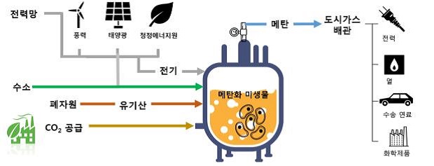 더불어 신재생에너지의 잉여발전량을 이용해 메탄가스를 생산 후 저장했다가 필요할 때 저장된 메탄가스를 기존의 도시가스 배관을 통해 공급할 수 있는 P2G(Power to Gas) 기술을 통해 바람, 구름 등 날씨 변화에 따라 시시각각으로 변하는 풍력 및 태양광발전 등의 출력을 안정적으로 유지할 수 있어 신재생에너지의 에너지저장장치로 떠오르고 있다.