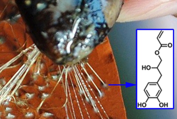 홍합은 족사를 바위에 붙이기 위해 접촉면을 산성상태로 만들어 표면을 준비하고 산화되기 쉬운 접착물질인 카테콜의 산화를 방지한다. 특히 연구진은 카테콜(미네랄 표면에 두 치아가 물리는 형태로, 동시에 두 개의 강력한 수소결합을 가능케 하는 페놀성 화학작용기) 함량이 홍합족사의 접착 표면에 집중된 것에 주목하였다.