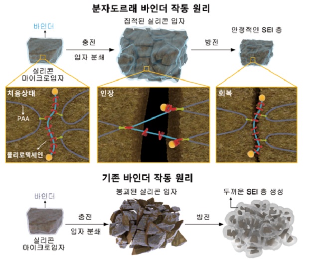 연구팀은 2016년 노벨화학상을 수상한 분자 도르래 구조를 최초로 도입하여 고용량 이차전지 고분자 바인더를 개발하였다. 연구결과, 탄성이 높은 분자도르래가 실리콘 전극을 안정적으로 잡아줘서 부피 팽창이 500회 이상 반복해도 실리콘이 부서지거나 전극에서 떨어지지 않았으며 전극 용량도 상용 수준인 3밀리암페어아워/제곱센티미터(mAh/cm2)를 유지하였다. 이는 현재 IT 기기에 쓰이는 리튬이온전지의 수준을 상회하는 것이라고 연구팀은 설명했다.