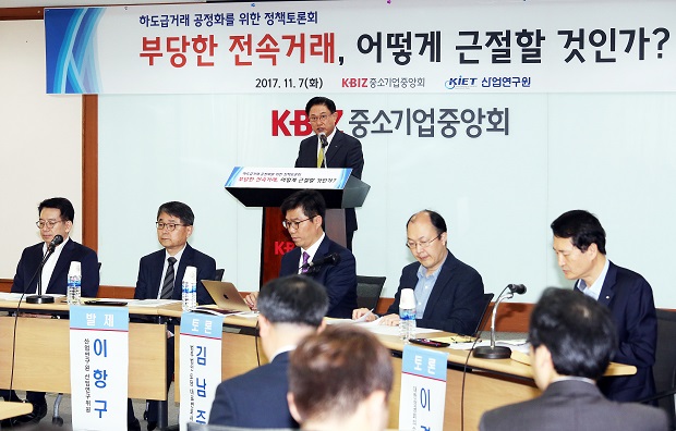 김경만 중기중앙회 경제정책본부장은 “대·중소기업의 장기 협력관계는 공정거래가 보장되는 제도적 틀 안에서 하도급법에 전속거래를 강요하는 행위를 금지하는 내용을 신설해야 한다”며 “지침을 통해 부당한 경영간섭 행위 유형을 명확히 규정할 필요가 있다”고 밝혔다.