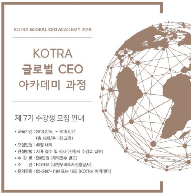 KOTRA는 해외진출에 관심 있는 국내 기업 최고경영자의 글로벌 비즈니스 역량을 강화하기 위해 ‘2018 글로벌 CEO 아카데미’를 개설한다.