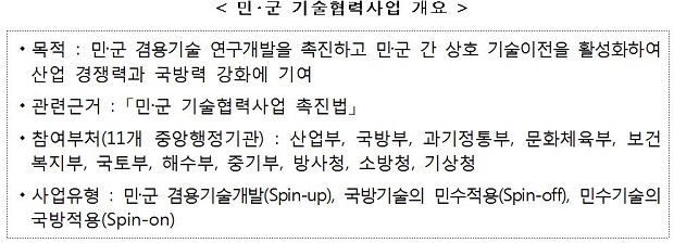 민·군 기술 협력사업은 민·군 겸용기술의 개발을 촉진하고 민·군 간 상호 기술이전을 활성화함으로써 산업 경쟁력과 국방력 강화에 이바지하기 위해 지난 1999년부터 시작했다.