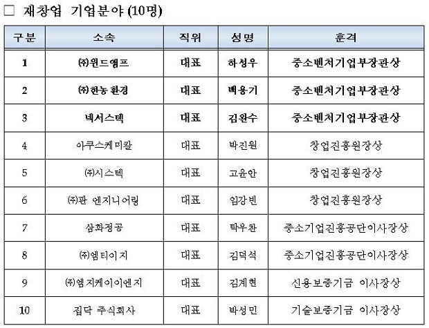 실패를 극복한 재창업 기업인으로 ㈜윈드앰프의 하성우 대표, ㈜한농환경의 백용기 대표, 넥서스텍의 김완수 대표가 중기부 장관상을 수상했으며, 재창업자 육성에 기여한 재창업 기반조성 유공자로는 신용보증기금의 곽영남 팀장, 신용회복위원회의 한창복 부장, 안병희회계사무소의 안병희 대표가 중기부장관상을 수상했다.