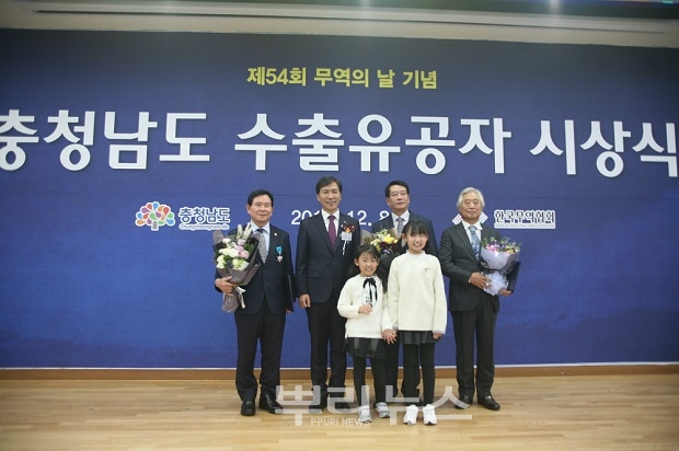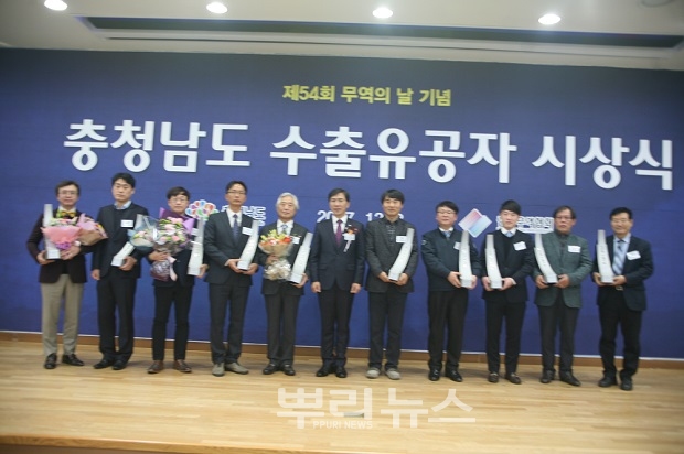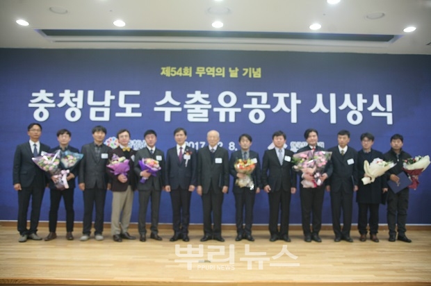한편 충남도와 한국무역협회 대전세종충남지부가 공동으로 주관한 ‘2017 제54회 무역의 날 기념 충남 수출유공자 시상식’에는 안희정 충남도지사와 김경용 무역협회 대전세종충남지역본부장, 안경남 대전세종충남기업협의회장 및 기관·단체장, 기업인 등 100여 명이 참석했다.