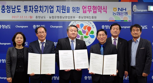 충남은 11일 도청 국제회의실에서 NH농협은행 충남영업본부, 충남경제진흥원과 업무협약을 맺고, 국내투자유치 기업에 대한 행·재정적 지원을 통한 투자촉진 환경조성에 힘을 모으기로 했다.