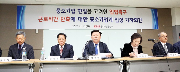박성택 중기중앙회장은 “지금도 생존에 허덕이고 있는 영세 기업들은 당장 눈앞에 다가온 최저임금 16.4% 인상을 감당하기에도 벅찬 상황”이라며 “최소한 영세 중소기업에 대해서는 근로시간 단축에 따른 문제점과 실태를 충분히 점검하고, 추가 인력공급 대책을 마련한 뒤에 도입할 수 있도록 해야 한다”고 강조했다.