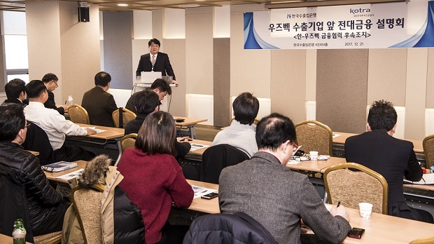 한국수출입은행(이하 수은)과 대한무역투자진흥공사(이하 KOTRA)가 21일 여의도 수은 본점에서 우즈베키스탄 수출기업들을 대상으로 ‘전대금융(轉貸金融) 설명회’를 공동 개최했다.