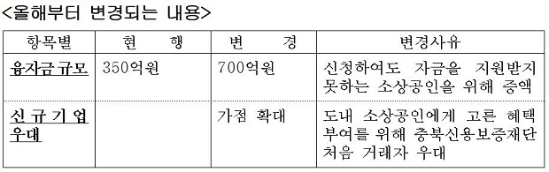 아울러 충북은 도내 소상공인에게 고른 혜택 부여를 위해 충북신용보증재단에서 보증 등 혜택을 처음 받는 업체를 우대할 계획이다.