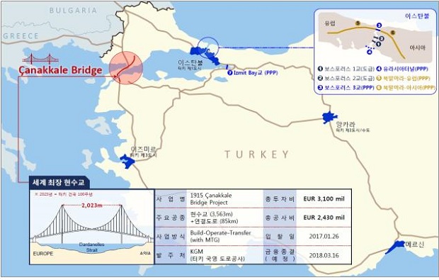 차나칼레 현수교는 총 사업비 31억 유로로, 터키 정부가 서남부지역 경제 활성화를 위해 민관협력사업(PPP)으로 추진한다.