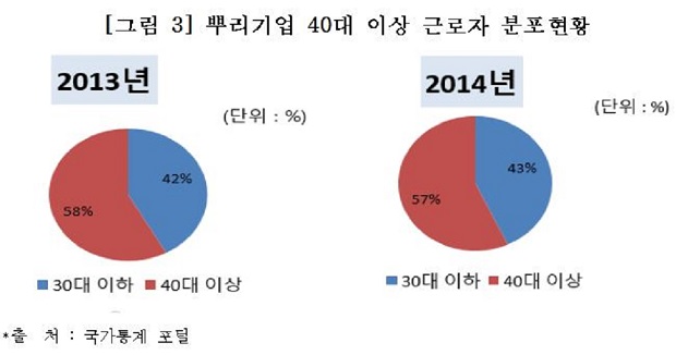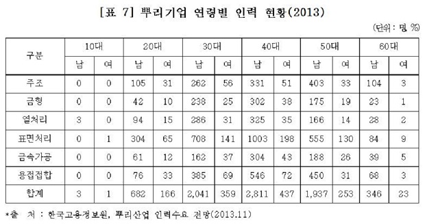 뿌리산업인적자원개발위원회가 지난 2016년 발표한 ‘2016년도 인력수급실태조사 분석 보고서’에 따르면 통계청의 자료를 분석한 결과 뿌리기업은 신규 인력수급난이 지속되면서 40대 이상 노동자가 2013년도 42%, 2014년도 43% 등으로 구성비가 증가하고 있는 것으로 나타났다.