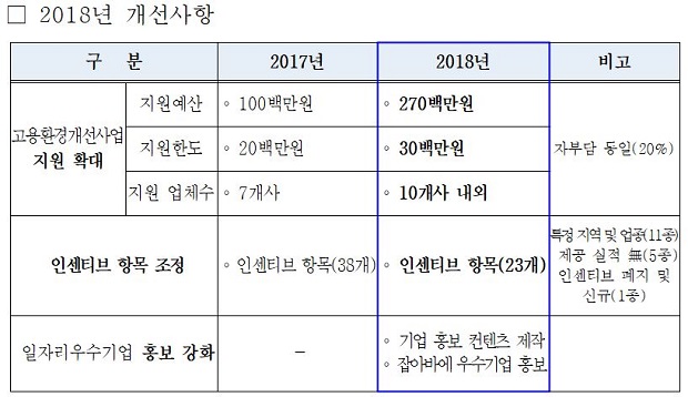 특히 올해는 ‘고용환경 개선’ 지원 예산을 전년 1억 원에서 3억 원 까지 증액했으며, 1개사 당 지원 금액도 최고 2,000만 원에서 3,000만 원까지 확대했다. 이에 따른 지원업체도 전년 7개사에서 올해 10개사로 늘어날 전망이다.