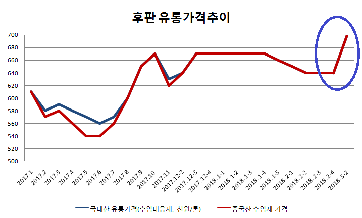 종전 유통 가격은 수입대응재가 톤당 64만원 수준을 보였던 점을 감안하면 이번 가격 인상으로 톤당 70만원 수준에서 유통 가격이 형성되고 있다. 중국산 수입 제품의 가격도 비슷한 수준에서의 공급이 추진되고 있는 상황이다.