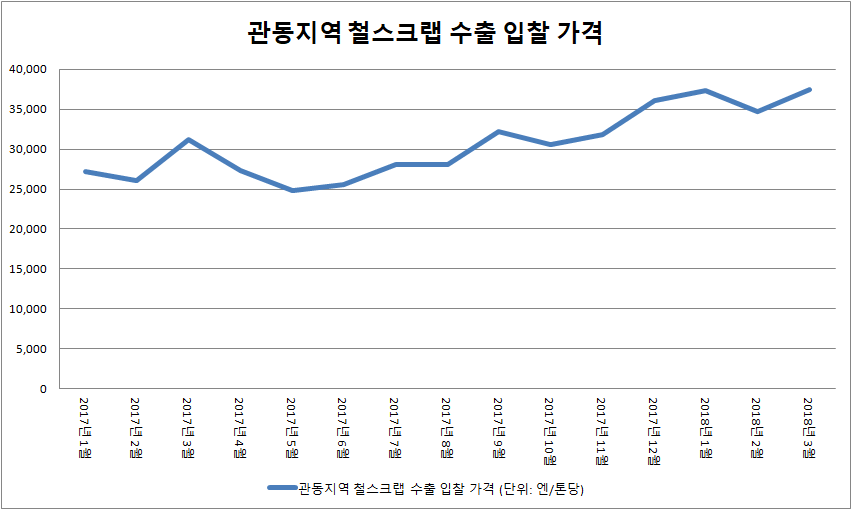 일본 관동철원협동조합이 최근 실시한 철스크랩 평균 입찰 가격은 H2등급 FAS기준 톤당 3만7,520엔으로 전월대비 2,770엔 상승했다. 물량은 총 2만톤이며 이를 FOB가격으로 환산하면 톤당 약 3만8,500엔 수준이다.