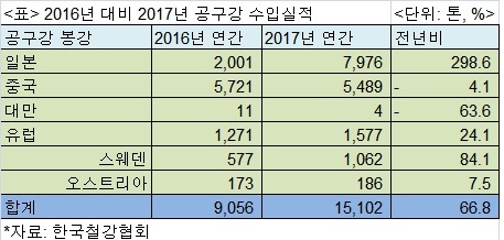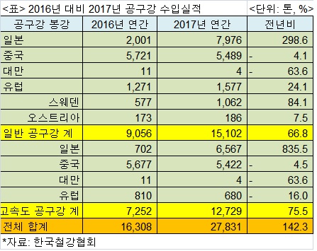 2017년 공구강 수입은 일본산과 유럽산 수입은 큰 폭으로 증가한 반면 중국산과 대만산은 상대적으로 감소한 것으로 나타났다.