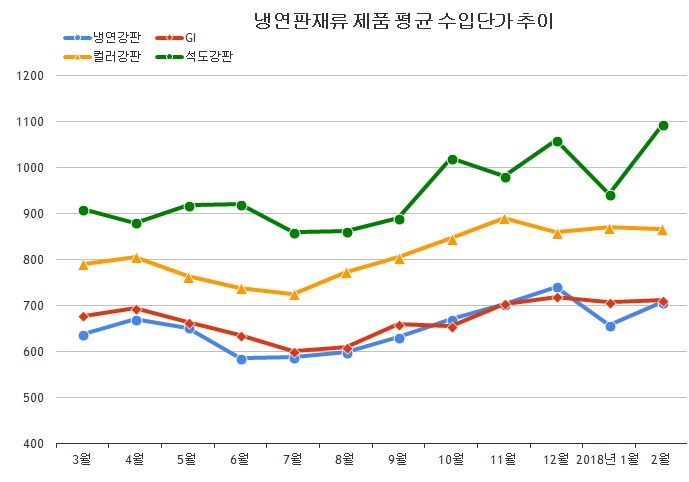 특히 납기 등 여러 면에서 국산 제품의 효용성이 높기 때문에 현재 가격대에서는 국산 제품의 메리트가 많은 것으로 판단된다. 다만 3월에는 전문 압연업체들이 가격을 올리고 포스코도 4월에는 가격이 올라가는 시점이어서 3월 이후 수입 동향은 지켜봐야 하는 상황이다.