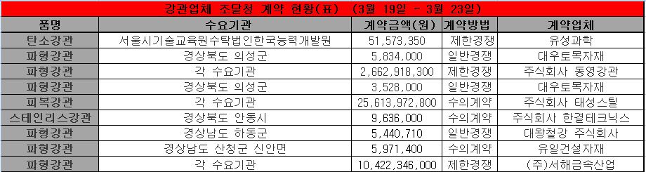 강관업체 조달청 계약 현황(표) (3월 19일 ~ 3월 23일)