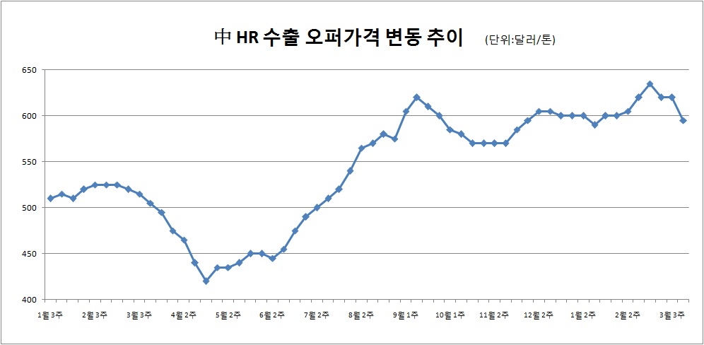 (이슈) 中 HR 수출 오퍼價, 600달러 붕괴…하락 움직임 가속화