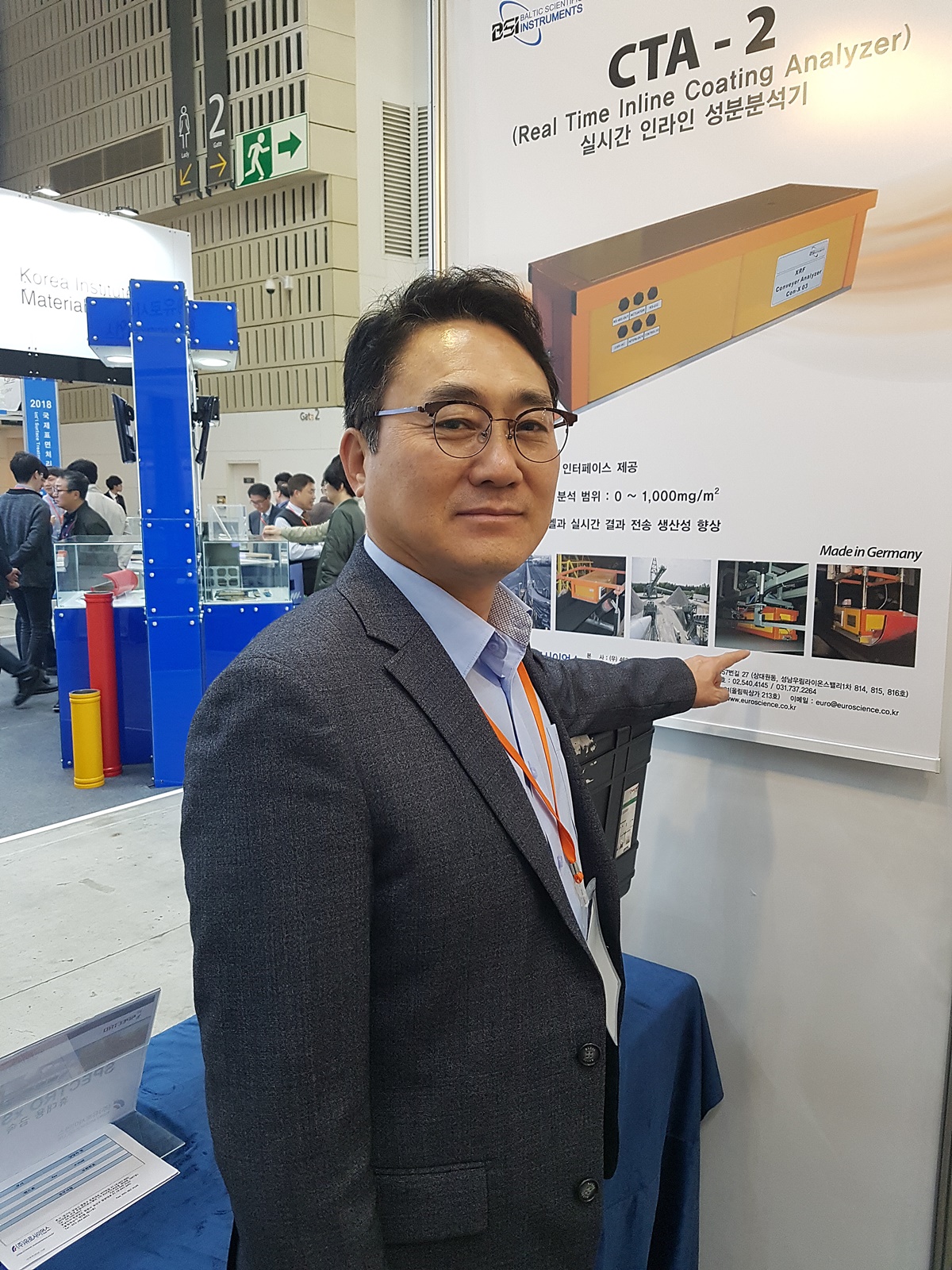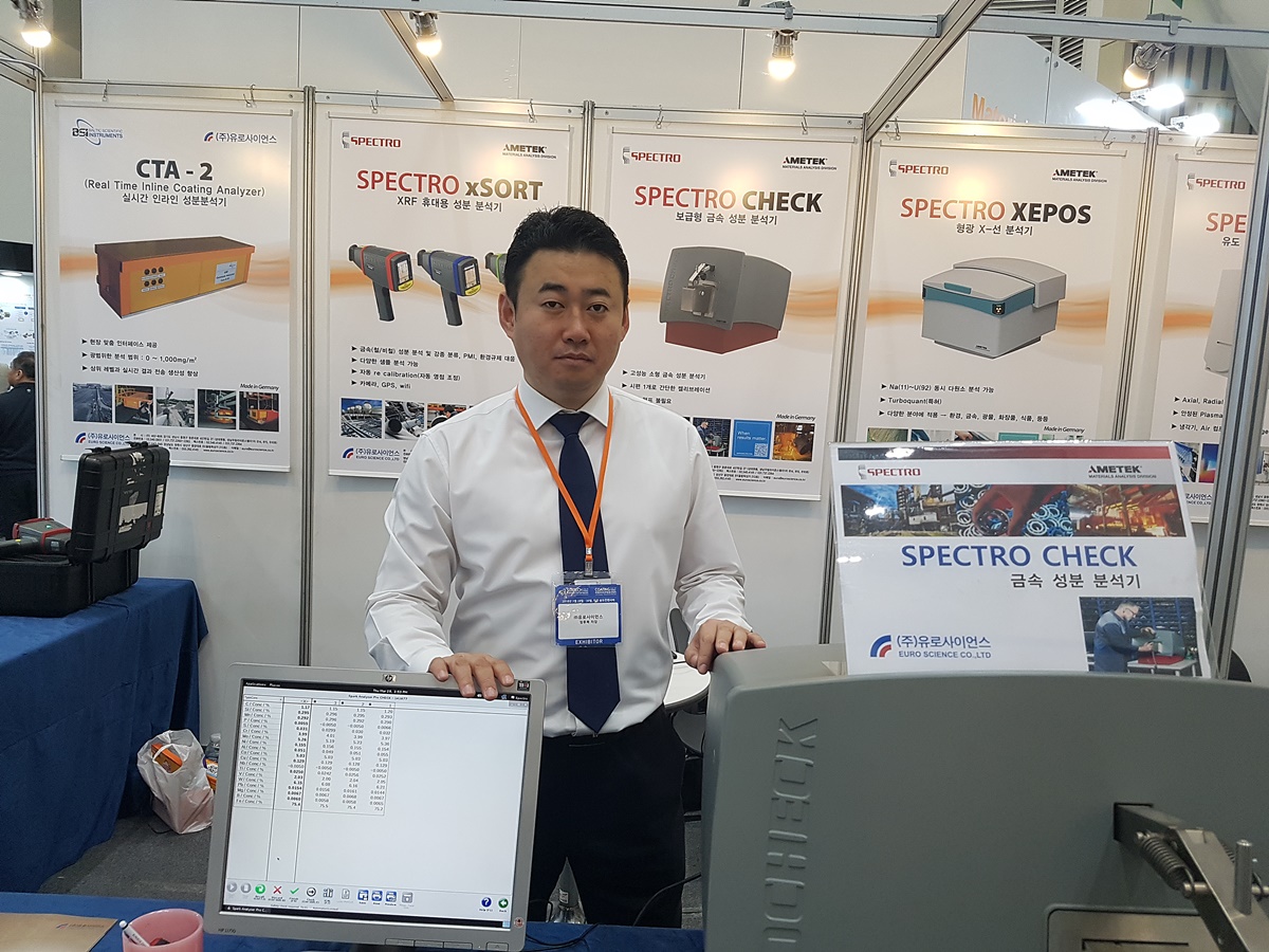 29일 오후 송도 컨벤시아 유로사이언스 부스에서 만난 이기용 상무는 포스코 광양 NO.4 CGL에 실시간 인라인 성분분석기(형광 X선 분석장치)를 공급해 도금함유량 유무를 체크하고 있다며 지난해 초 장비를 공급하고 지난해 9월 FAT(Final Acceptance Test)를 끝냈다고 설명했다.