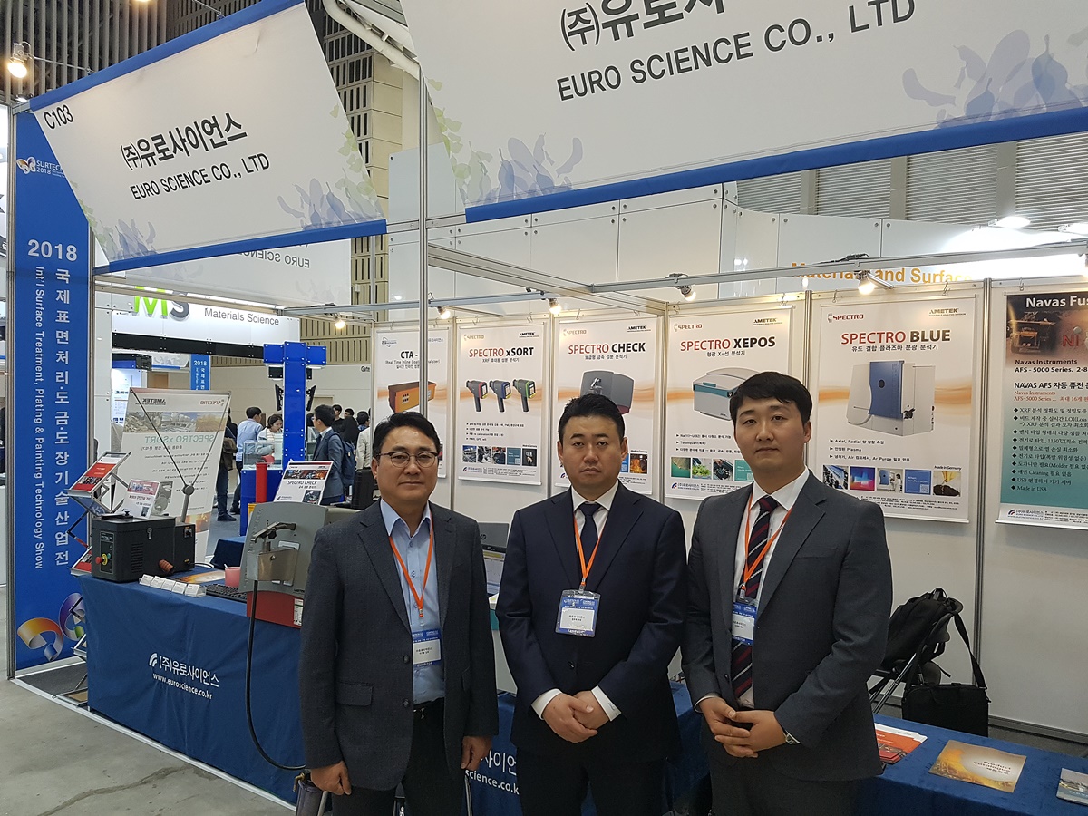 3월28일~30일까지 인천 송도 컨벤시아에서 열리고 있는 ‘2018 국제표면처리 도금·도장 기술산업전(Sur-Tech Korea 2018)에 참여하고 있는 금속성분분석기 공급업체인 유로사이언스(대표 김문일)는 실시간 인라인 성분석기, 스크랩 재질분석 장비, 자동차부품 등 보급형 금속성분 분석기, 액체, 분말 고체강태 시료를 통해 성분을 분석하는 다양한 장비를 선보였다.
