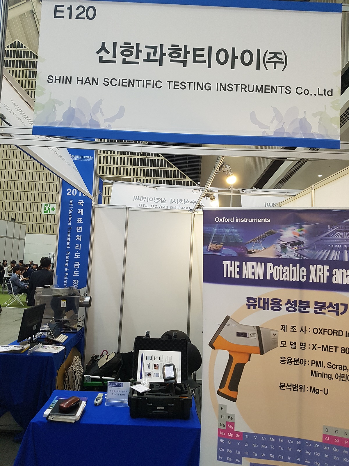 금속성분분석기 공급업체인 신한과학티아이(사장 허창녕)는 3월28일~30일까지 인천 송도 컨벤시아에서 열리고 있는 ‘2018 국제표면처리 도금·도장 기술산업전(Sur-Tech Korea 2018)에 참여해 X-MET 8000 이동형 금속 성분분석기를 선보였다.