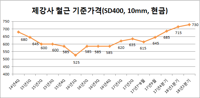 최근 철스크랩 가격 상승 이후 동국제강이 지난 3월 29일 철근 가격 인상을 발표한 바 있다. 업계 관계자는 “현대제철, 동국제강이 철근 기준가격을 인상함에 따라 여타 제강사들도 원가 상승 압박으로 철근 가격을 인상할 것으로 전망된다”고 전했다.