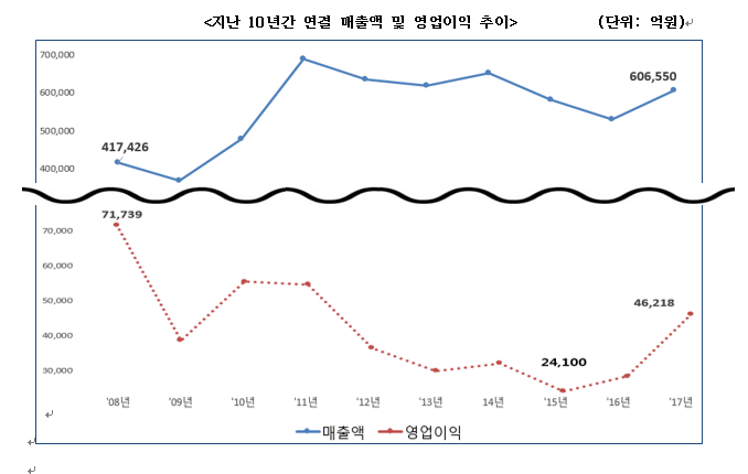 포스코는 2017년 구조조정 마무리와 동시에 3년 만에 연결기준 매출 60조원대에 복귀하는 실적 달성했다. 연결 기준 매출액 60조 6,551억원, 영업이익 4조 6,218억원, 순이익 2조9,735억원을 기록했다.