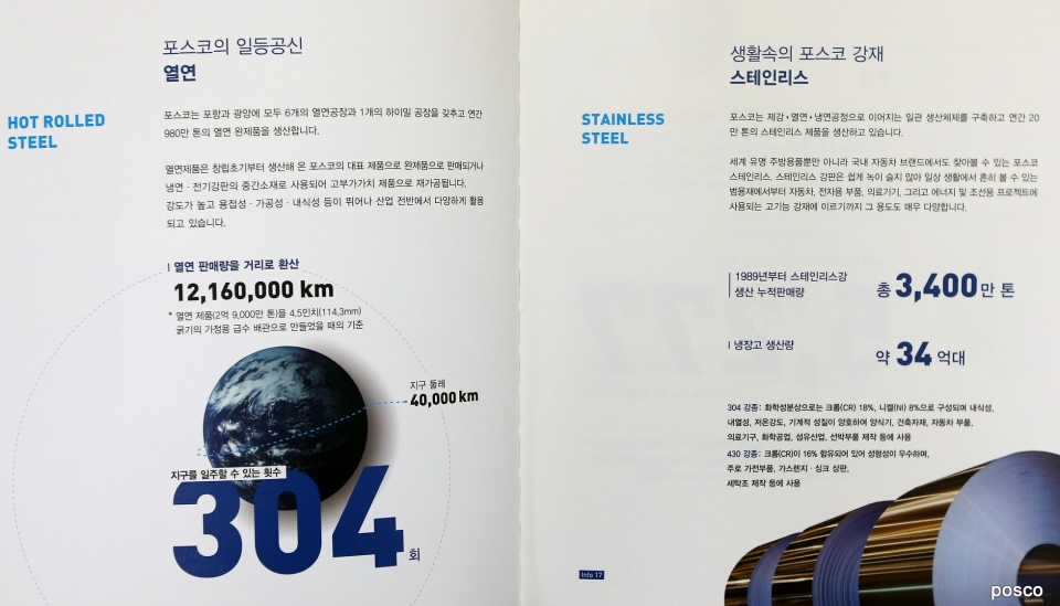 세계 유일의 내용적 5,500m² 이상 초대형 고로 5개 보유, 세계에서 가장 경쟁력 있는 철강사 8년 연속 1위, 서울-부산 왕복하는 거리의 제철소 컨베이어벨트 길이 등 재미와 흥미를 더하기 위해 스토리텔링 형식의 숫자, 인물, 다이어그램 등을 적극 활용했다.