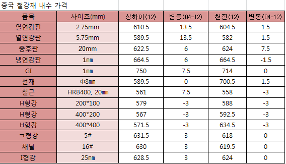 천진에서는 냉연강판이 1.5달러 하락한 것을 제외하고 판재류가 대부분 상승했다. 다만 H형강은 상하이와 천진 모두에서 3달러 하락했다.