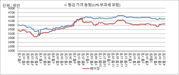 중국 ㄷ형강 내수가격이 보합을 보이고 있다. 중국 현지 소식통에 따르면 18일 중국 상하이 내수 ㄷ형강 가격(16# 기준)은 4,240위안이다. 베이징 내수 ㄷ형강 가격은 톤당 3,890위안 수준을 기록했다. 안종호 기자 jhahn@snmnews.com 다른 기사 보기 관련기사 (형강) ㄷ형강, 수요 부진에도 수입 급증 ㄷ형강, 2월 수출 감소·수입 증가 4월 1주차 中 ㄷ형강, 내수價 보합 3월 5주차 中 ㄷ형강, 내수價 보합 3월 4주차 中 ㄷ형강, 내수價 보합 Al 판 3월 판매 1.3% 감소 대도철강, 화성공장 영업 활성화 ㄱ형강, 수출 줄고 수입 늘어 4월 4주차 中 ㄷ형강, 내수價 보합 ㄷ형강, 3월 수출 감소·수입 증가 (형강) ㄷ형강, 공급과잉 지속 4월 5주차 中 ㄷ형강, 내수價 보합 5월 2주차 中 ㄷ형강, 내수價 보합 5월 3주차 中 ㄷ형강, 내수價 보합 5월 4주차 中 ㄷ형강, 내수價 보합 저작권자 © 철강금속신문 무단전재 및 재배포 금지