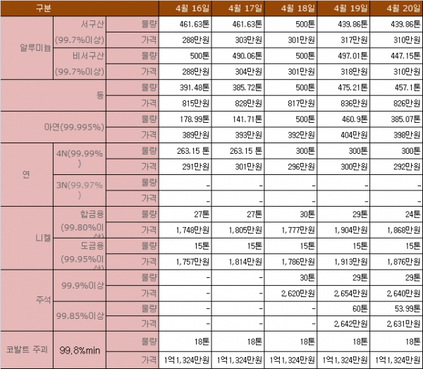 4월 20일 조달청 비철금속 비축물자 방출가격