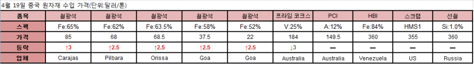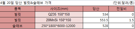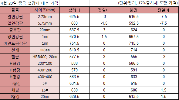 오늘 중국 열연강판 가격이 하락했다. 상하이에서는 규격별로 3달러 1.5달러 하락했고 천진에서는 하락폭이 더 커져 7.5달러 하락했다. 상하이에서 중후판과 냉연강판 가격은 상승했다. 철근 가격은 지역별로 다르게 나타났다.