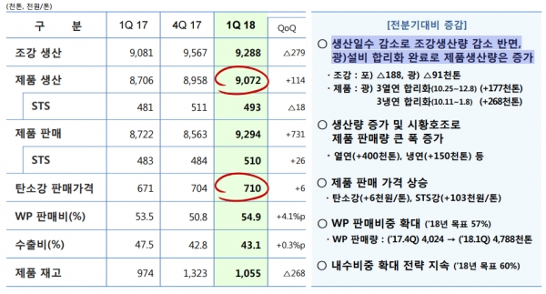 포스코는 생산일수 감소로 조강 생산량은 감소한 반면, 광양 등 설비 합리화 완료로 제품 생산량은 증가했다고 전했다.